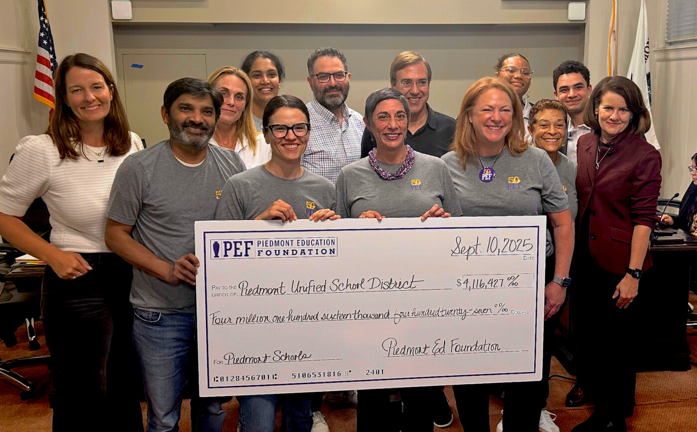 The Piedmont Education Foundation (PEF) proudly presented a record-breaking check for $4,116,427 to the Piedmont Unified School District (PUSD) school board on Wednesday, September 10. This extraordinary grant is the largest in PEF’s history and reflects a full year of community-powered fundraising through the Giving Campaign and other programs, such as Spring Fling, Harvest Festival, Dress Best for Less, business sponsorships, and a distribution from the PEF Endowment Fund.