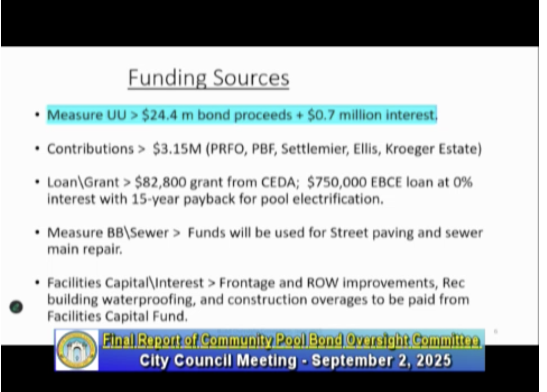 Finance Director Kiran Bawa shared a powerpoint presentation of the June 2025 update that highlighted the different funding sources for the project. She noted that soft costs, that were limited to 20% of Measure UU funds, came in below that figure at 18%.