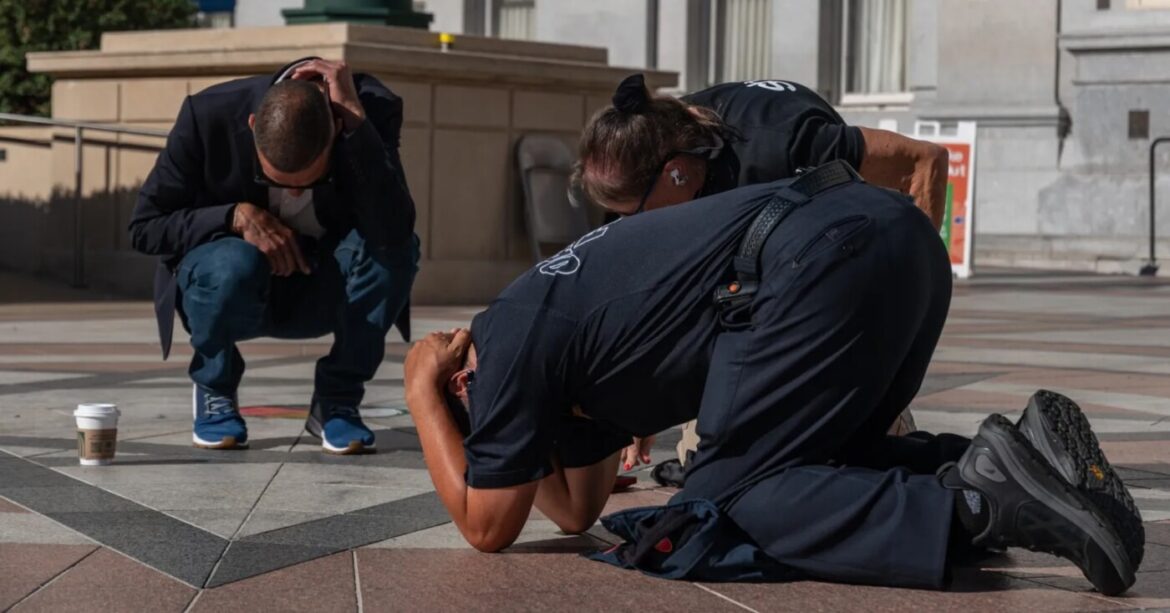 Throughout the morning, Oakland city employees practiced the “drop, cover, and hold” drill from inside their offices and outside in Frank H. Ogawa Plaza.