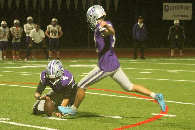 But only briefly. Lagios hit Max Fujimoto with an 11-yard scoring pass with just 19 seconds left in the half for a 14-8 lead at the break. Kennedy went for a fourth-and-eight near midfield in the third quarter but Alex Lee and Colby Hong came up with the stop. Five plays later, Lagios connected with Dash Waters-Worthen for an eight-yard touchdown pass and it was 21-8. Piedmont got a late touchdown on a 15- yard run by Mumtaz to complete the scoring.