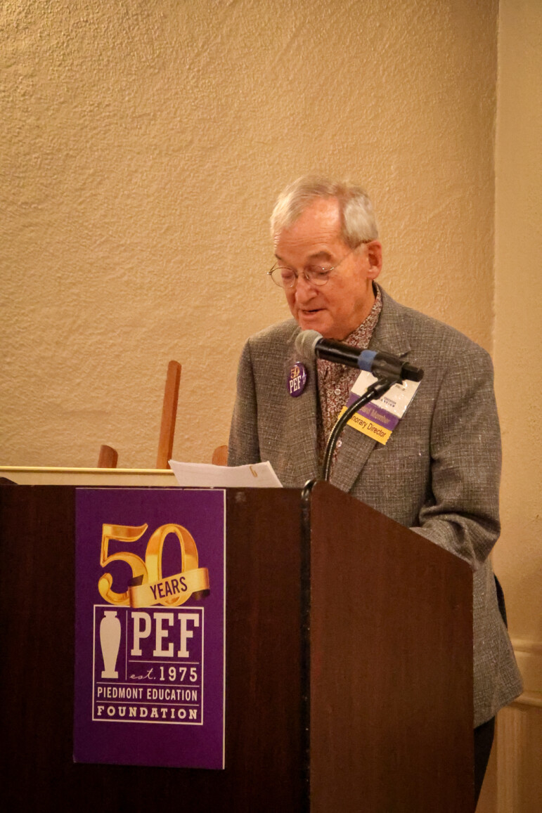 PEF Board Member Rich Thompson served as Master of Ceremonies, guiding the evening’s reflections and recognitions. Cameron Wolfe, Jr., one of PEF’s early Board Presidents, shared stories from the organization’s founding, highlighting the vision of the original signers and early leaders, including Helen Breck, PEF’s second Board President and an active member until her retirement in 1988, and Steffi Mooers, the third President who launched PEF’s first modern fundraising campaign in 1981.