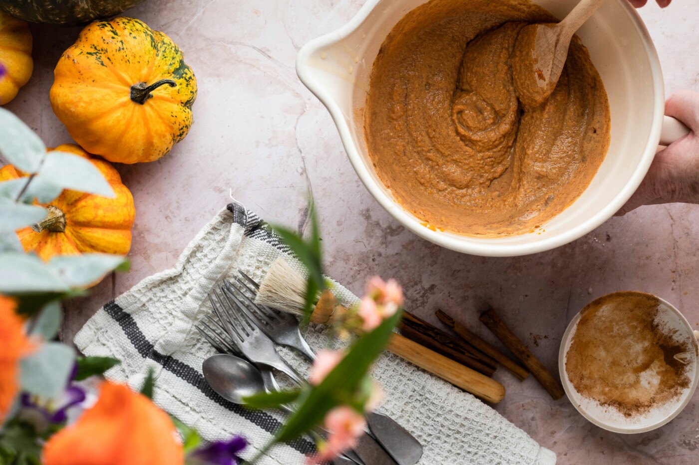 - Place 1 (15-ounce) can pumpkin purée, 1 cup half-and-half, 2/3 cup packed brown sugar, 2 large eggs, 1 1/2 teaspoons pumpkin pie spice, and 1/2 teaspoon kosher salt in a stand mixer. Beat with the paddle attachment until smooth.