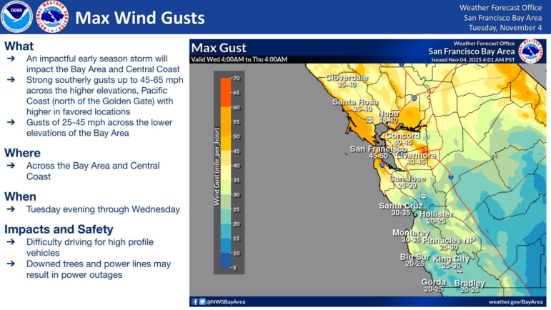 The storm’s gusty southerly winds will generally spike at about 45 mph for most of the region, but there is the potential for winds of about 60 mph in higher elevations like Mount Diablo and Mount Saint Helena, he said.