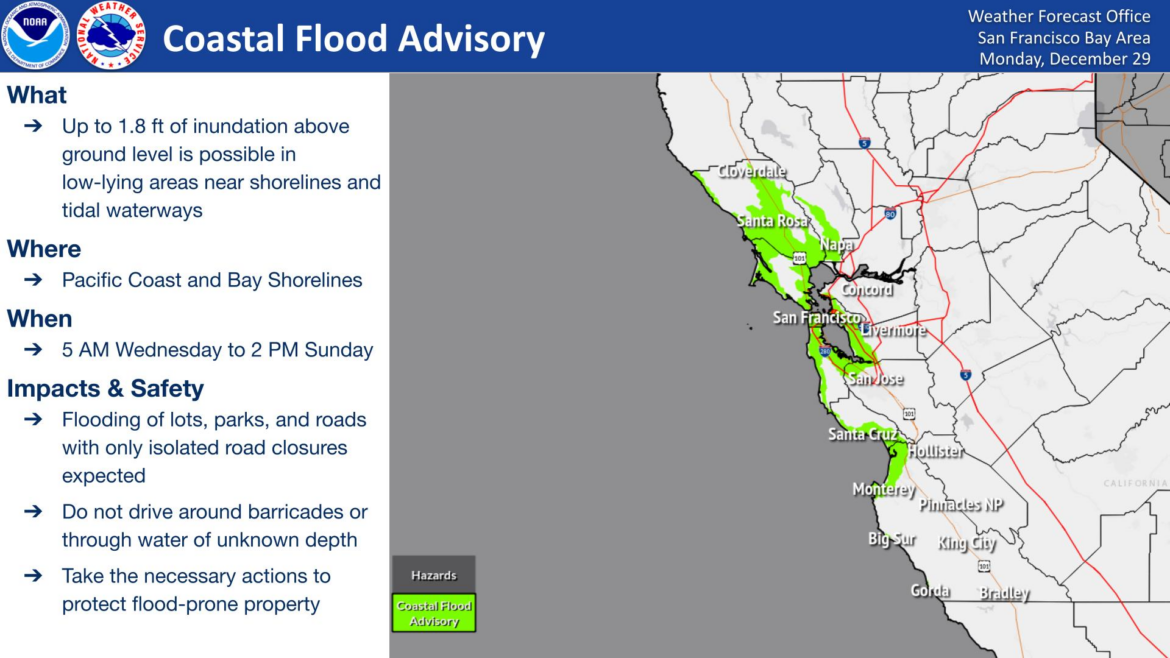 The wet weather will coincide with the return of king tides on Wednesday, which will make minor flooding likely in the region’s usual locations, such as low-lying areas along the San Pablo and San Francisco bays.