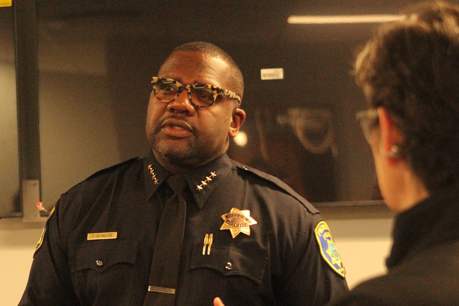Piedmont police chief Frederick Shavies explains the functions of the city’s new dispatch center during a public tour.