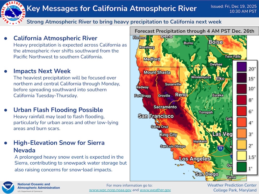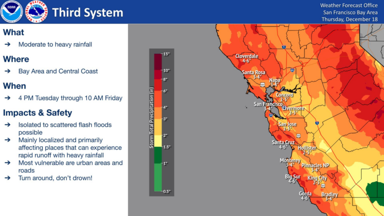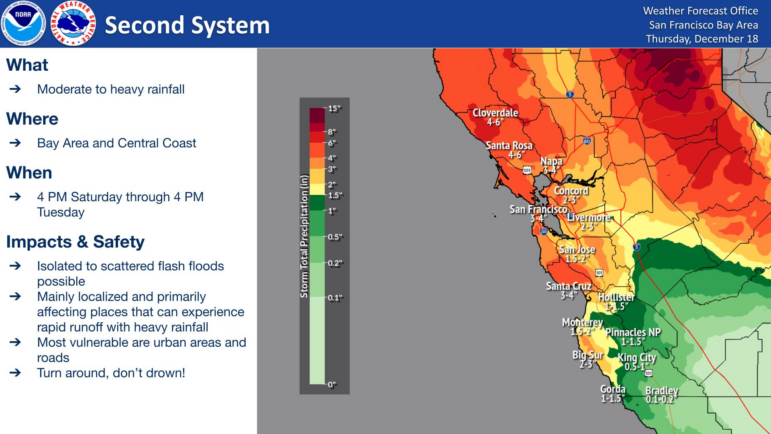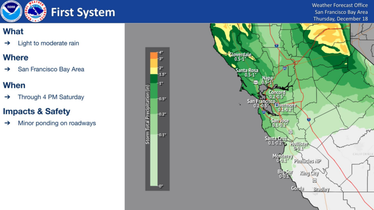 Just in time to snarl traffic and holiday travel plans: The National Weather Service says a set of three storm systems will bring moderate to heavy rainfall to the Bay Area through Friday, Dec. 26. If you’re flying or driving to the mountains, check conditions and leave plenty of time for delays.