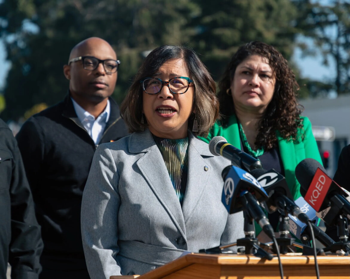 Alameda County Supervisor Nikki Fortunato Bas speaks at the Alameda County Administration Building in Oakland, Calif., on Oct. 31, 2025. Bas authored ordinances approved this week creating ICE-Free Zones and a countywide rapid-response plan to protect immigrant communities. (Andres Jimenez Larios/Bay City News)