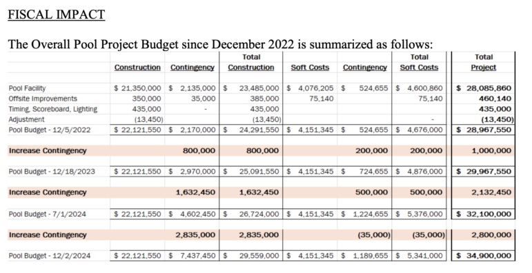 - December 2023: City Council votes to boost pool budget, now at nearly $30 million. In the name of keeping the project moving forward and ready for further unexpected costs, the Council voted to take $1 million from the city’s Facilities Capital Fund in order to fortify the pool’s construction and contingency budgets.