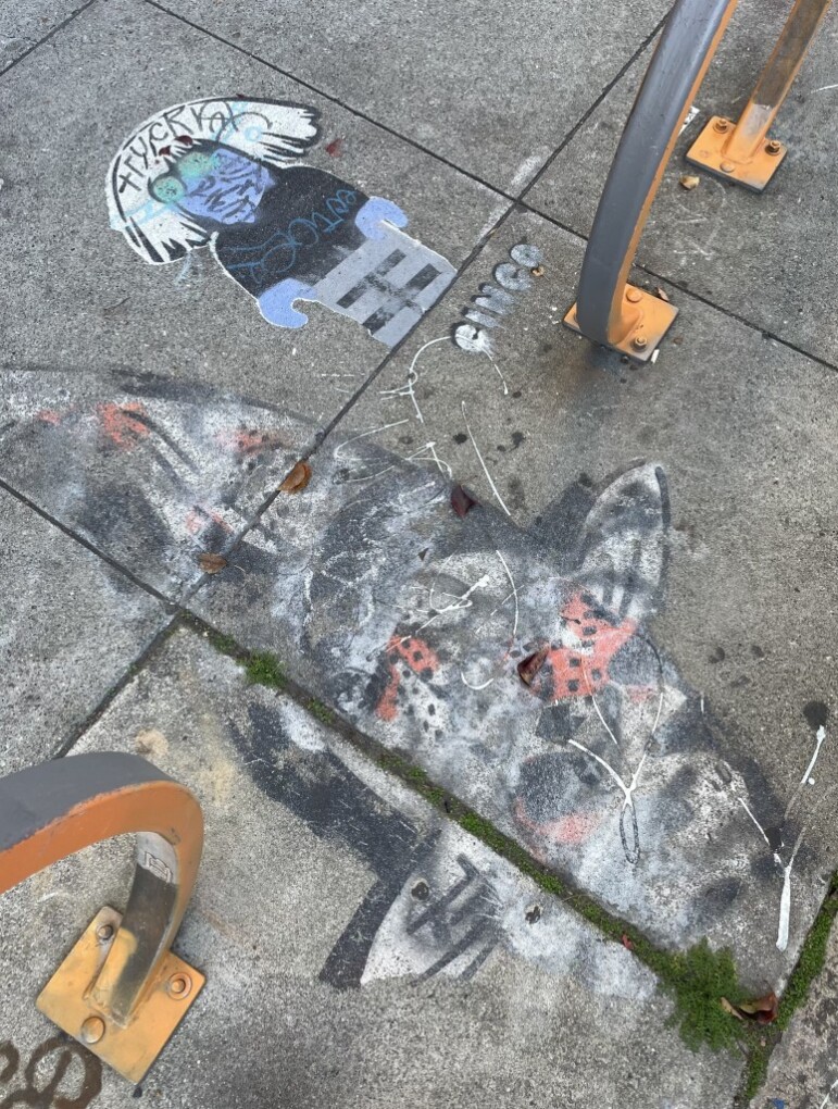 On a Duboce Avenue sidewalk, an Ongo is next to a koi fish mural by Jeremy Novy. Ongo’s anonymous artist says Novy is one of his inspirations. (JL Odom via Bay City News)