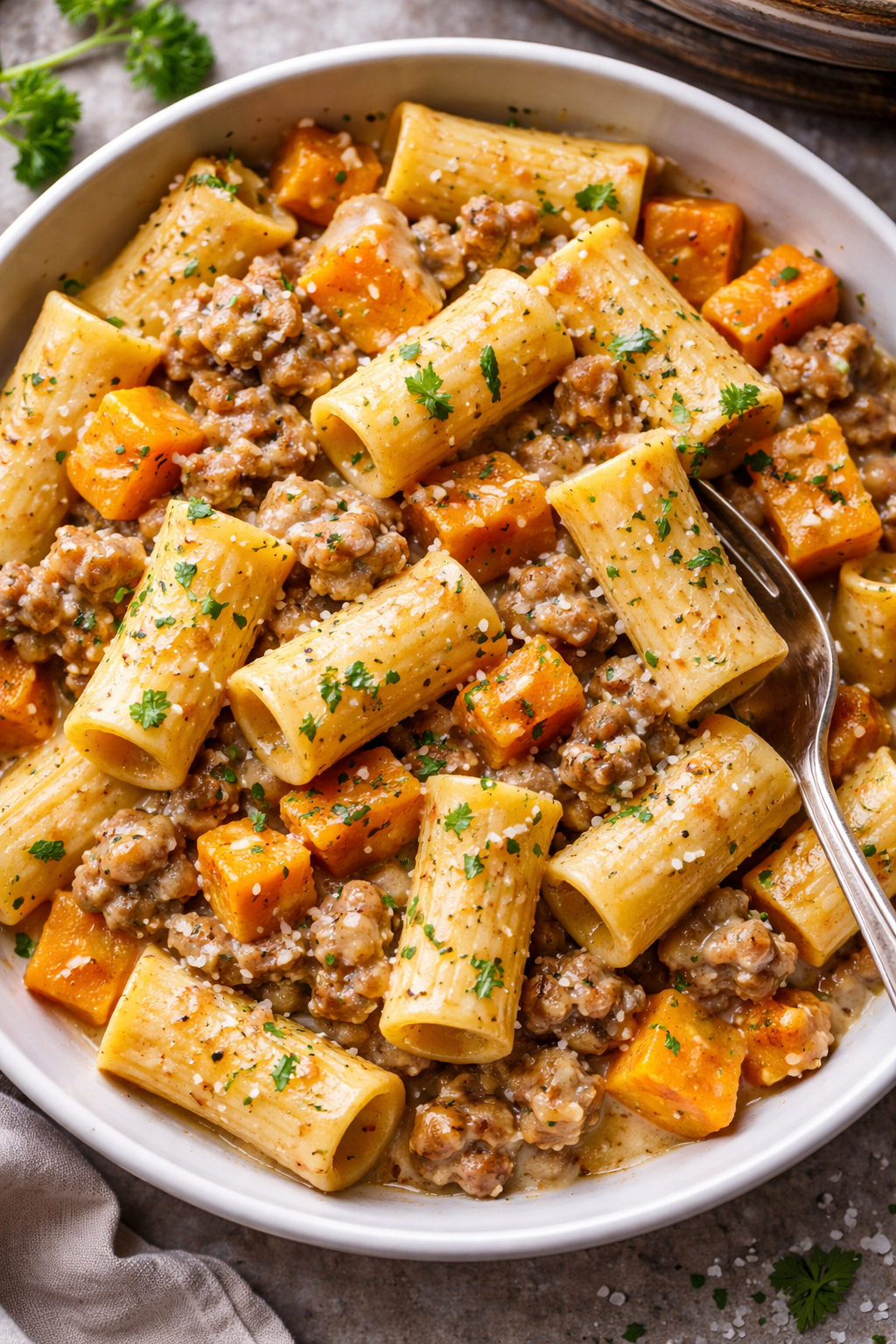 The secret to a great pasta dish is the play between textures and tastes. Here, the velvety texture of the squash acts as a counterpoint to the browned, salty crumbles of sausage. Finished with a dusting of Parmesan — perfecto!