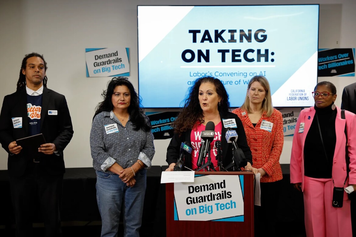 Gonzalez announced that the labor federation intends to sponsor or support two dozen bills this year to address how AI negatively impacts workers and called on Newsom to support them. Thus far, she said, the governor has failed to address what’s coming. The governor’s office did not respond to a request to respond to that accusation.
