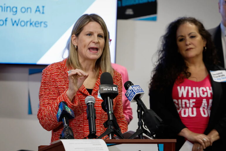 Liz Shuler, president of the AFL-CIO, addresses the media during a press conference on the impact of AI on labor in Sacramento on Feb. 4, 2026. Photo by Fred Greaves for CalMatters
