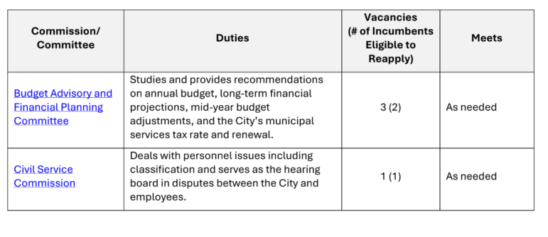 Applications are now open for appointed volunteer positions on the Budget Advisory and Financial Planning Committee, Recreation Commission, and as the City’s representative to the Mosquito Abatement District Board of Trustees.