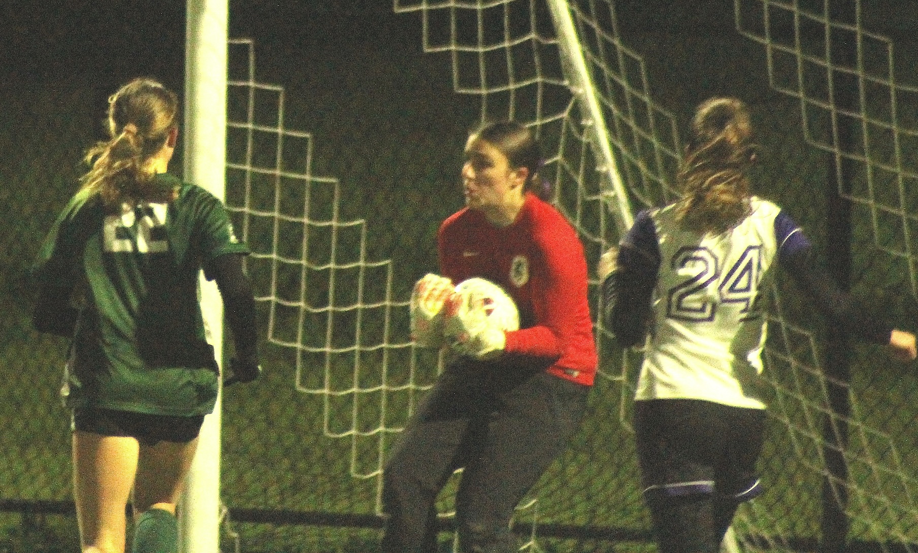 Piedmont goalkeeper Rachel Young (red) secures a save while Elaina Bruntlett (22) and Darcy McKee (24) converge.