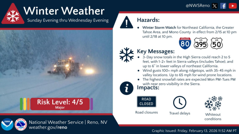 A major winter weather advisory is in place for the Greater Tahoe area starting Sunday night.