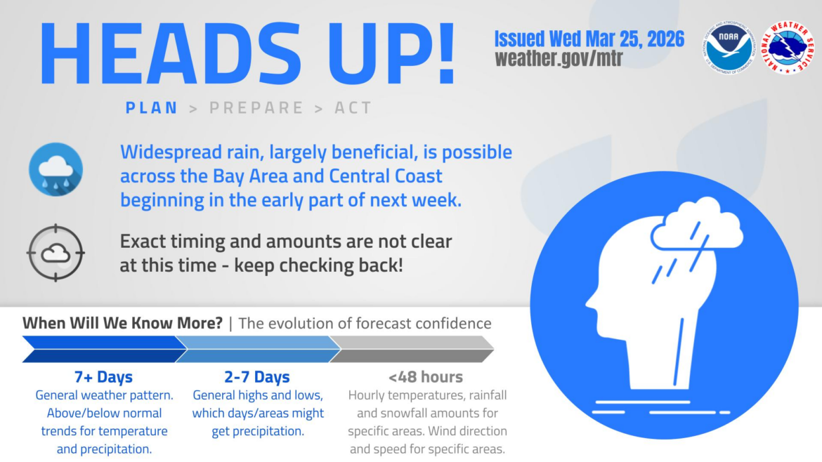 Tuesday will also see a chance of showers. On Wednesday rain is likely, mainly after 11 a.m., according to the weather service. A sprinkling of rain could return Thursday, but Friday is expected to be sunny with daytime highs around 70.
