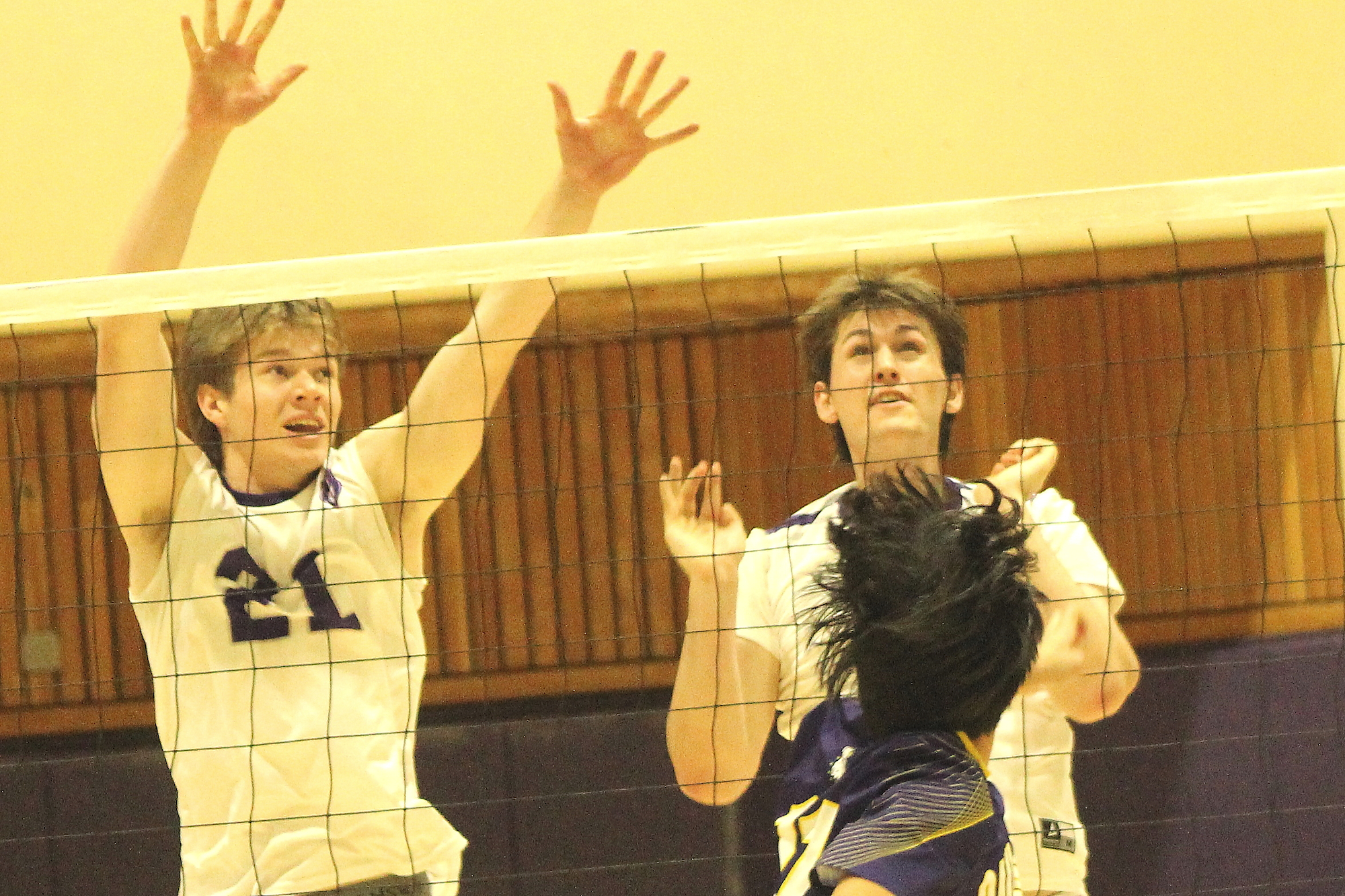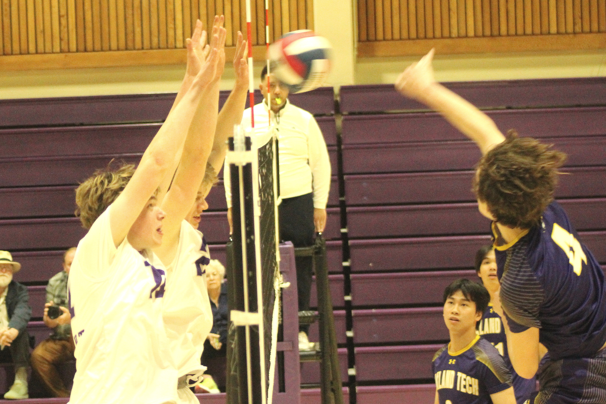 Drew Kobal (21) and Luck Peterson attempt to block Oakland Tech’s Khanh Si’s kill attempt.