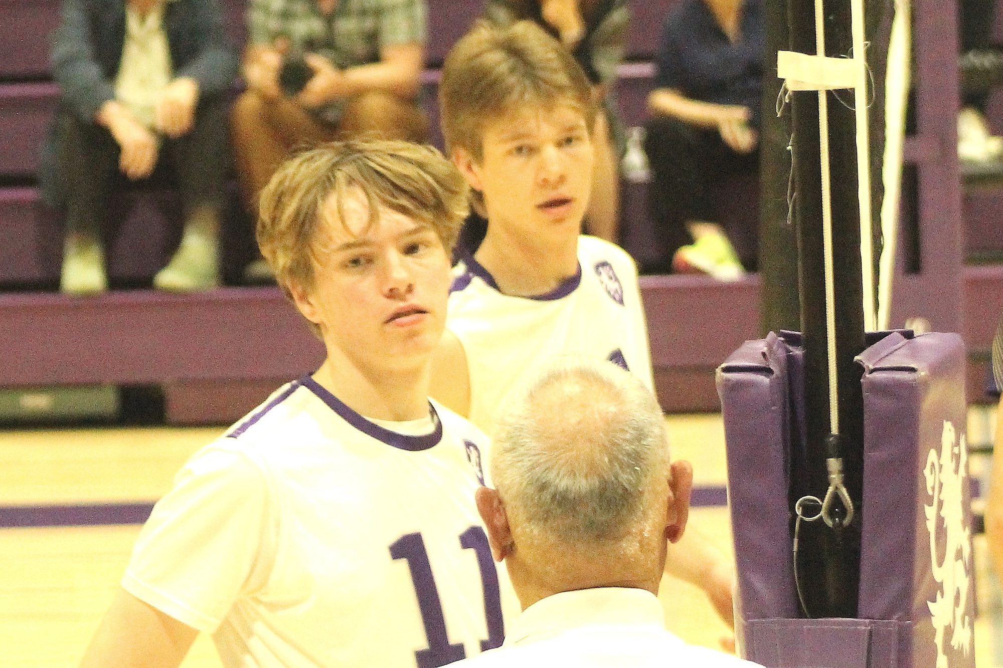 Gus Leahy (11) looks to the official for a call with Drew Kobal behind.
