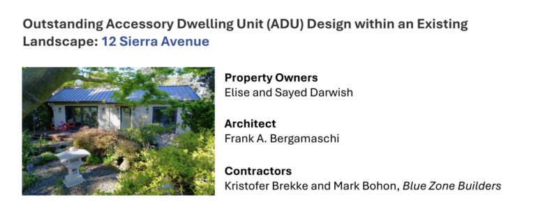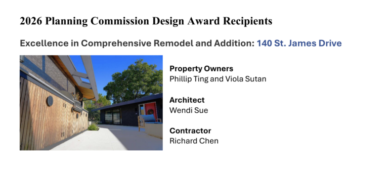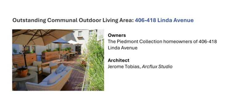 Each year, the Planning Commission recognizes a small number of exemplary projects with a Design Award. Projects selected for awards reflect the highest level of design excellence among all that have come before the Commission for review. To be eligible for consideration, a project must conform to Piedmont’s design and planning guidelines and must have completed construction in the previous calendar year.