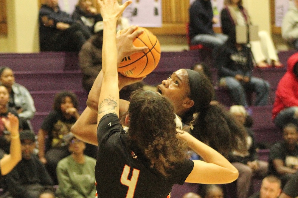 Andrea Martin (1) goes up for a shot while Savana Chase (4) contests