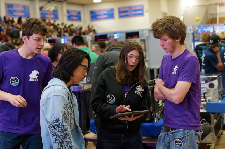Drive team members (left to right) Sam Charlson, Mason Kim, Cassie Colby, and Max Seiden prepare strategy before their match.