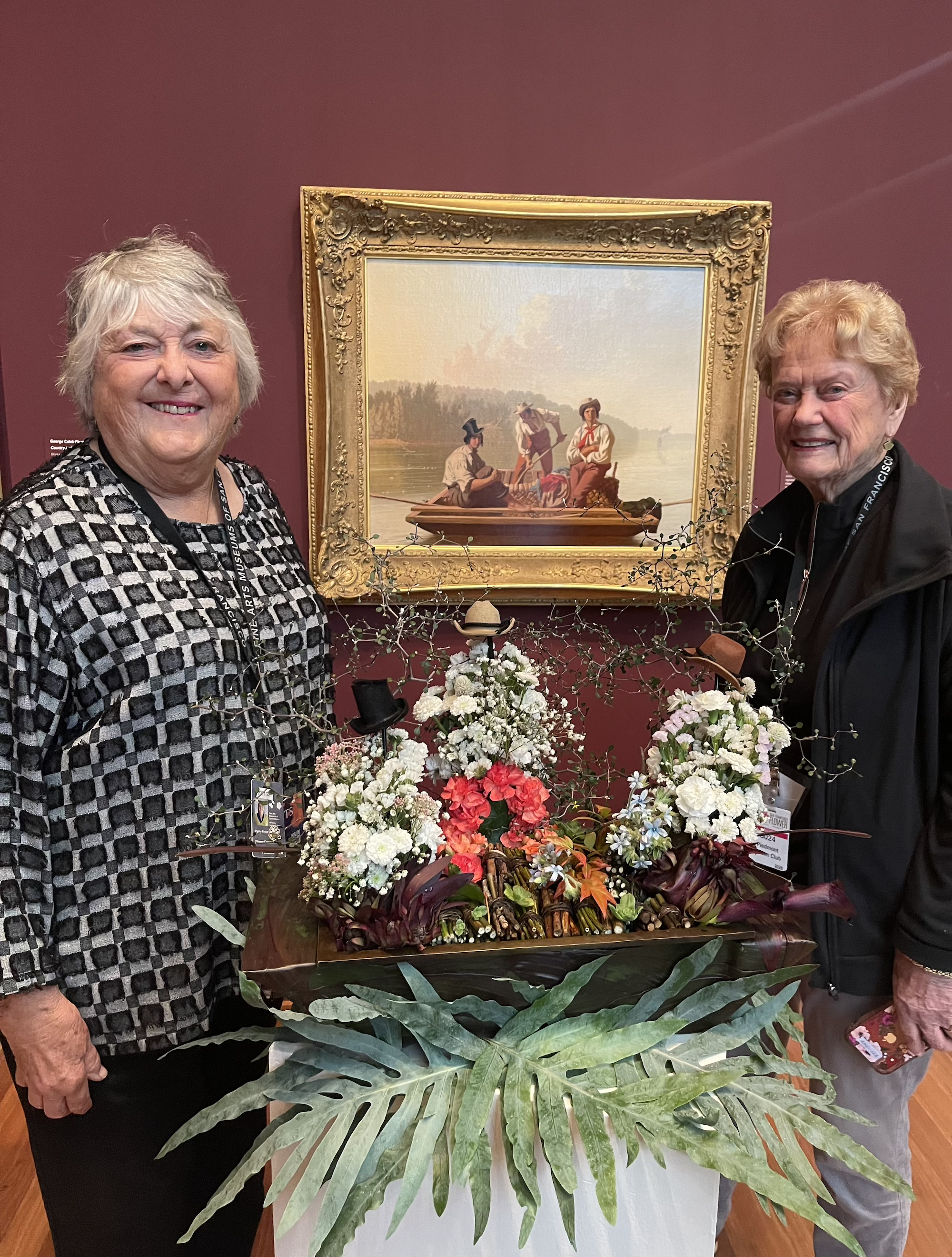 Piedmonter Patty Reed (left) is joined by partner Joy McCabe of Tiburon as they show off their floral design to accompany George Caleb Bingham’s ‘Missouri River’ (photo courtesy of Patty Reed)