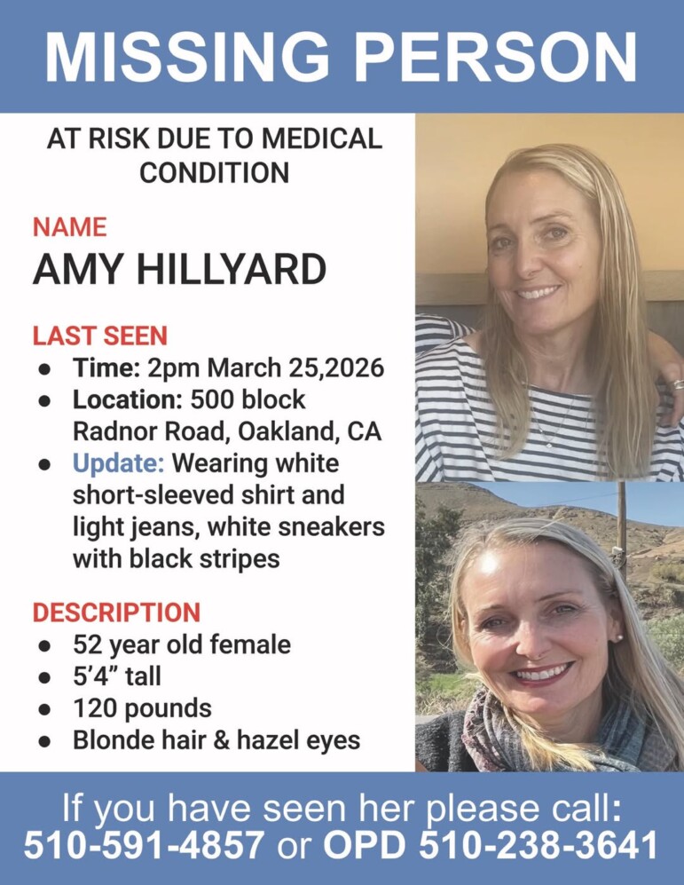 If you have any information regarding the whereabouts of Hillyard, please contact the Oakland Police Department’s Missing Persons Unit at (510) 238-3641.