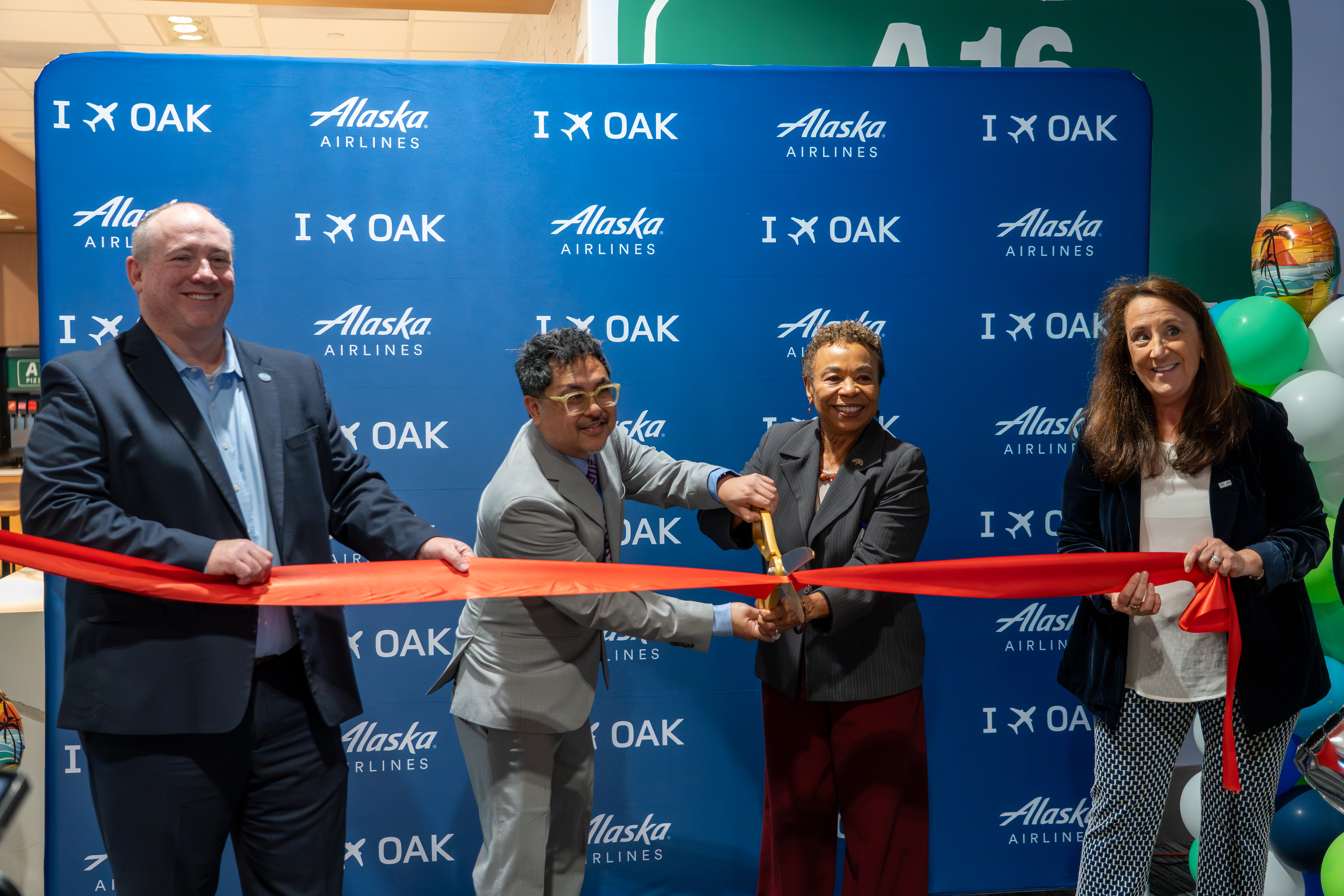 Oakland Mayor Barbara Lee and Alaska Airlines Station Manager Andre Lara at the ribbon-cutting ceremony for the first flight on the new Oakland to San Diego route on Wednesday, April 22, 2026, as airport Director of Aviation Craig Simon and Port of Oakland Board Commissioner Barbara Leslie look on.