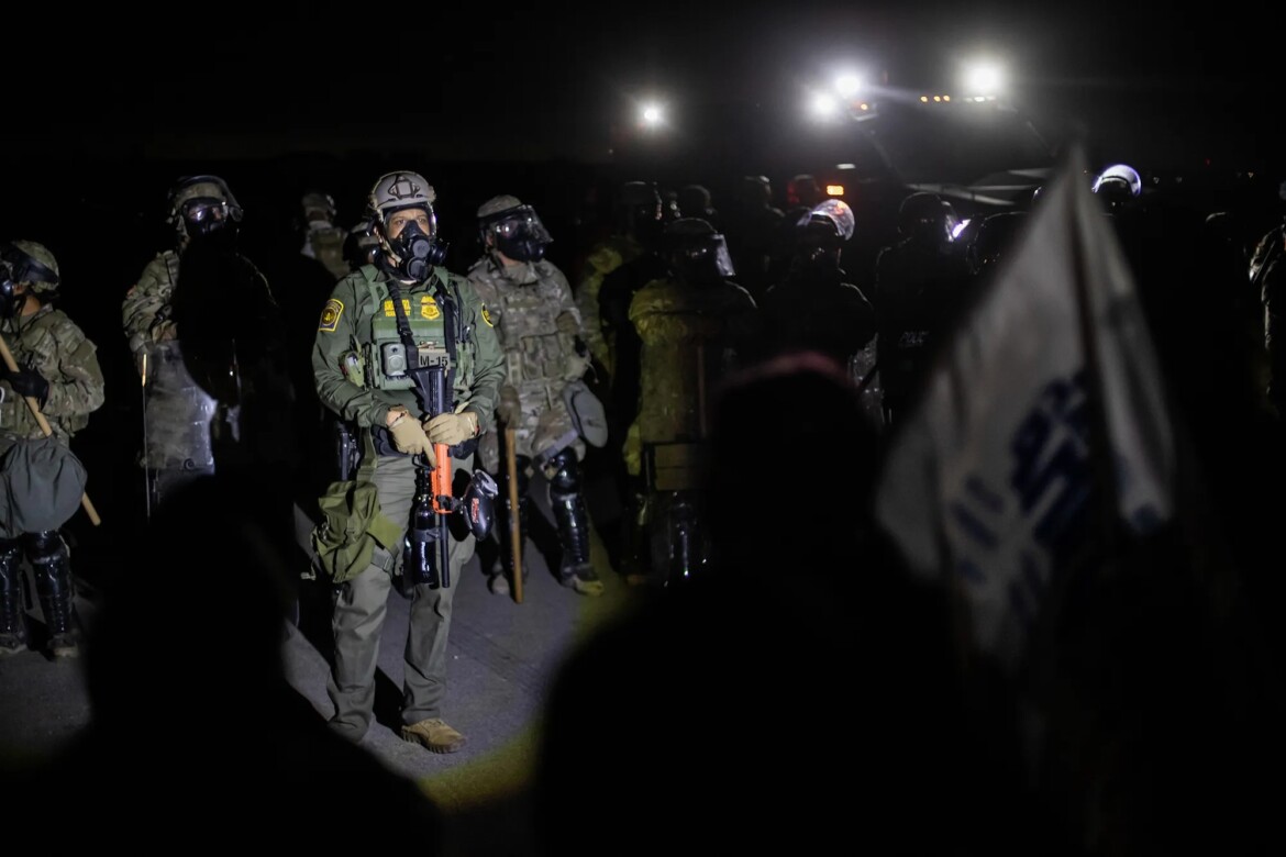 A line of federal immigration agents and protesters stand-off near the Glass House Farms facility outside Camarillo on July 10, 2025. Protesters gathered after federal immigration agents conducted an immigration raid earlier in the day. Photo by Larry Valenzuela, CalMatters/CatchLight Local.