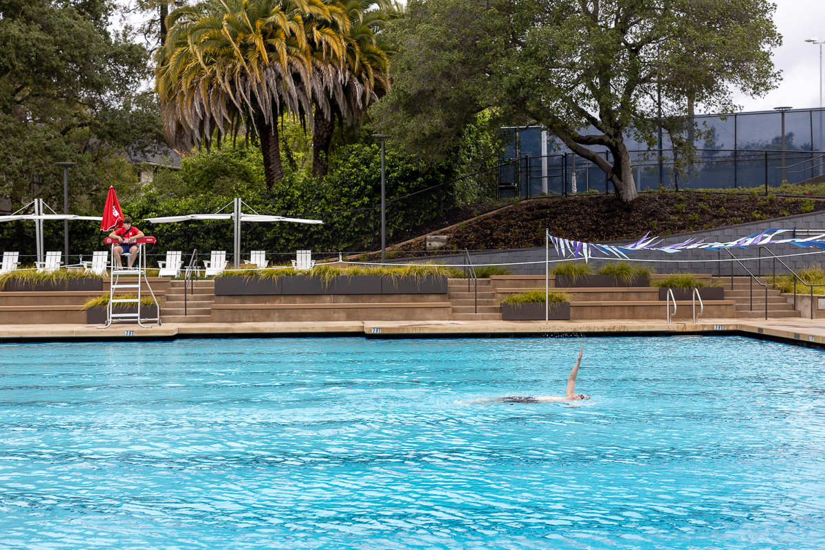 Plants are a major visual centerpiece of the new pool complex. The design by SWA Landscape Architects features drought-tolerant California native plants that support biodiversity by providing sustenance for pollinators, other beneficial insects, and birds. The existing large Coast live oak has been carefully preserved and another has been planted near the pool entrance. The wonderful fragrance of Winnifred Gilman sage surrounds the entrance path and the planting areas are filled with Howard McMinn manzanita and the lower-growing Pacific Mist manzanita. The hedge along the Magnolia Avenue side is another very valuable wildlife supporter, the Holly-leaved cherry.