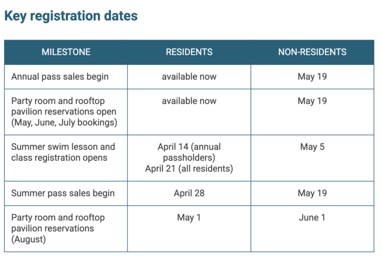 Resident registration for summer swim lessons at the new community pool opens on Tuesday, April 21 at 6 p.m.