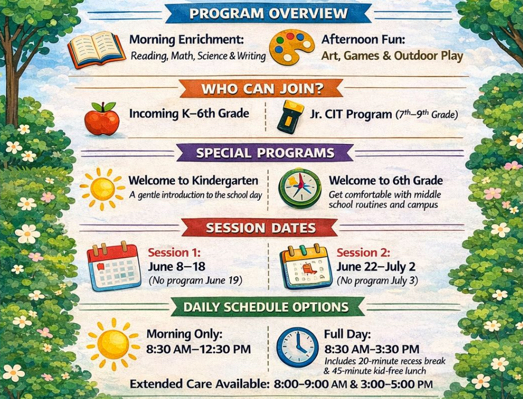 1st-5th Grade Adventures Program: Each morning, students will participate in engaging academic enrichment classes taught by PUSD teachers, featuring subjects like reading, math, science, and creative writing. The afternoons will be filled with recreational activities, including art, sports, and hands-on science projects, rotating through different choices each day.