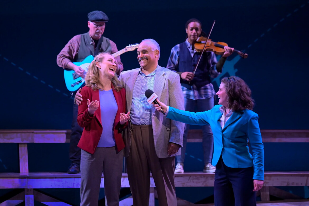L-R, front, Alison Ewing, Michael Gene Sullivan and Kaylee Ann, backed by musicians Tim Roberts and Christina Walton, are excellent in TheatreWorks Silicon Valley's "Come From Away" onstage through May 10 in Mountain View. (Kevin Berne/TheatreWorks Silicon Valley via Bay City News)