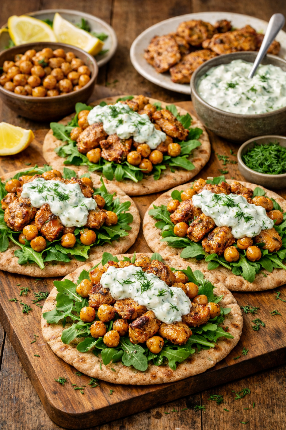 - Drizzle 2 teaspoons of oil over chickpeas and then smash with a fork. Toast or warm flatbreads and spread with chickpeas, chicken, arugula, and fresh dill. Season with salt and pepper.
