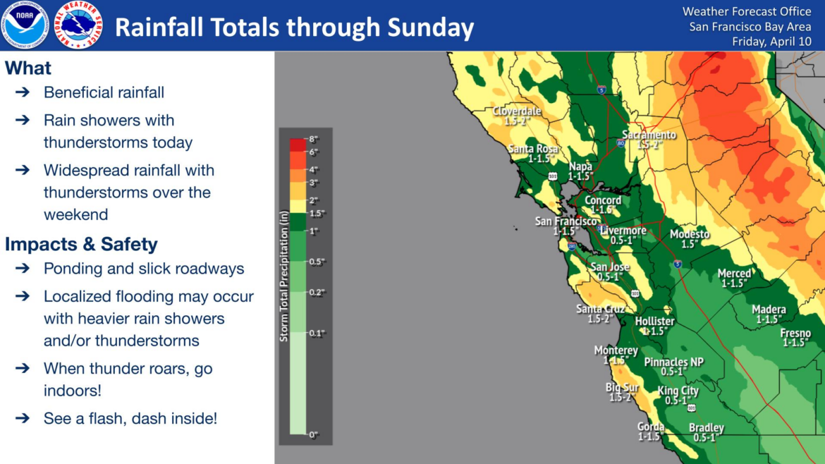The National Weather Service forecast for the greater San Francisco Bay Area for Friday calls for up to 90 percent chances of showers throughout Friday and continued rainfall through the weekend.