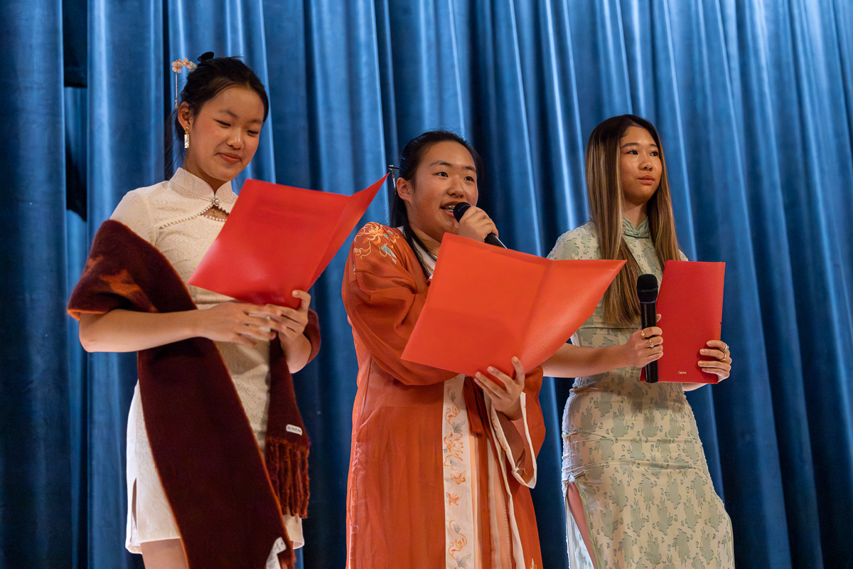 Student emcees Nicole Li, Amelie Wang, and Iris Feng