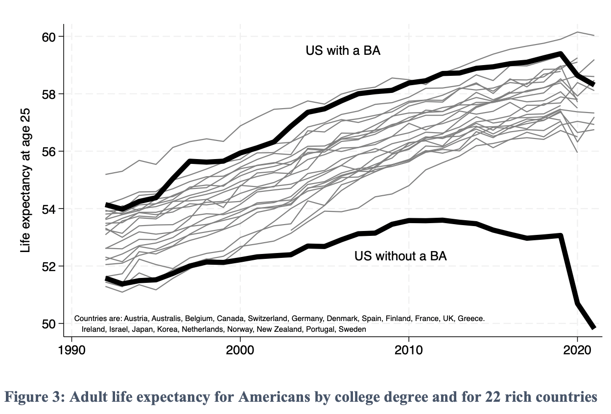 College More than ever, having a college degree foretells life and death outcomes By Emma Gallegos | EdSource | September 29, 2023 Mortality gap between those with and without a degree is growing “on steroids,” researchers say.