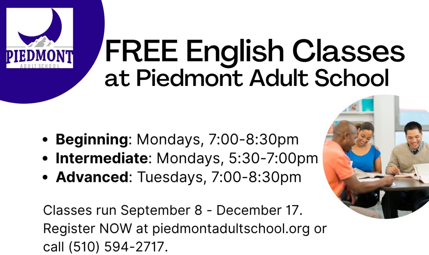 Around Town Free English classes at Piedmont Adult School By Michelle Lucas | Piedmont Adult School | August 8, 2025 ESL ('English as a second language') classes run September 8 - December 17.