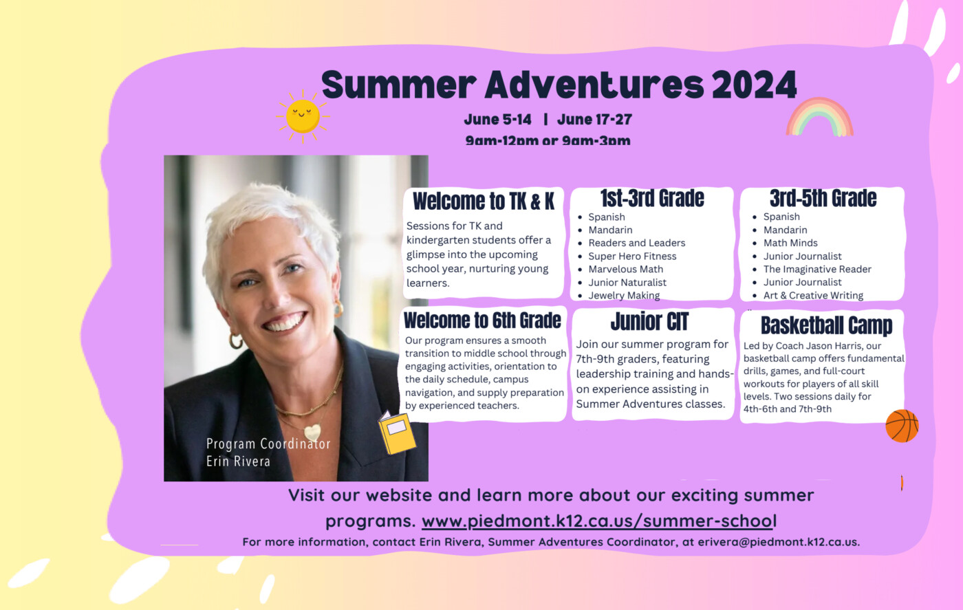 Around Town From TK to 9th grade, PUSD Summer Adventures has something for everyone By Piedmont Unified School District | April 14, 2024 Coordinator Erin Rivera brings 28 years of experience running PRD summer camps and programs.