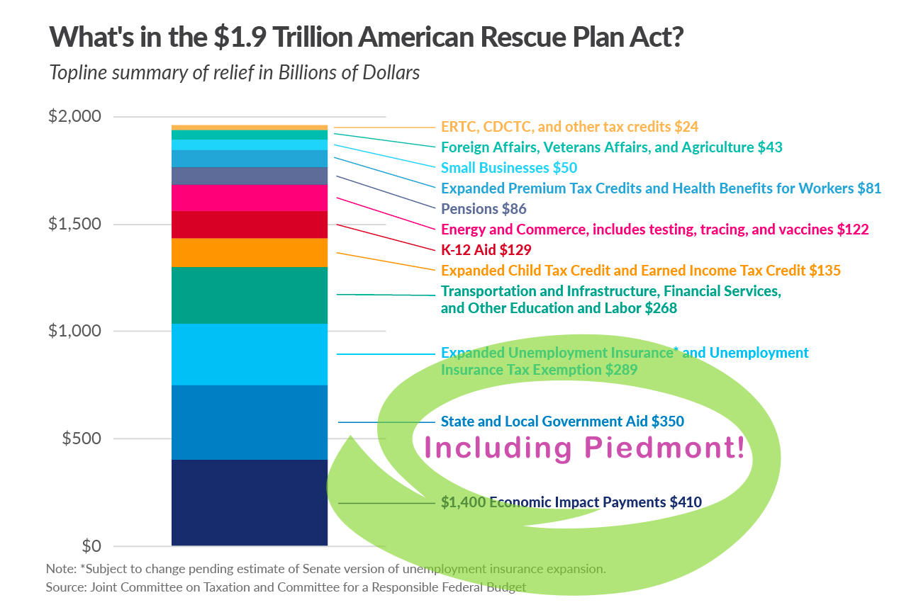 City Piedmont set to receive $2 million in COVID relief By Sam Richards | March 16, 2021 Piedmont is included in Biden's $1.9 trillion American Rescue Plan Act, but the details of how the city can use this money are still unfolding.