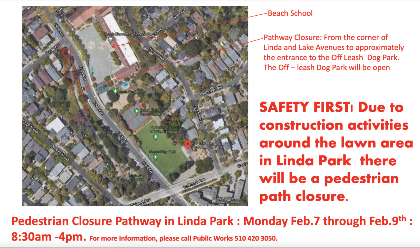 City Linda Park Path closure Feb. 7 – 9 By City of Piedmont | February 4, 2022 Construction work around Linda Park this week will affect a pathway to Beach Elementary School.