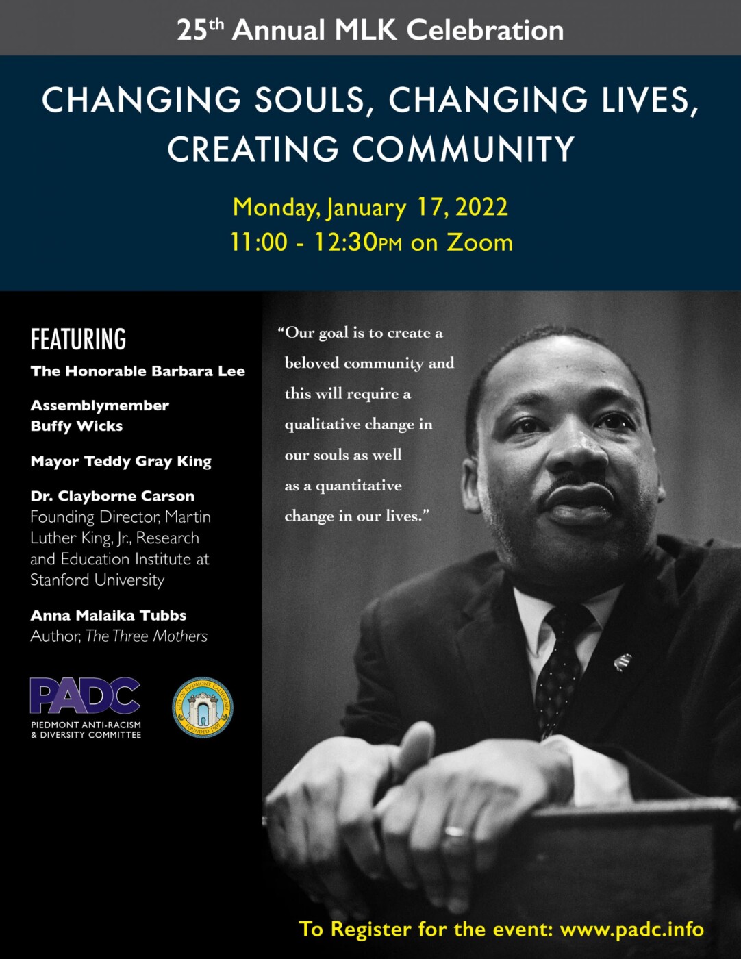 Around Town City and PADC host 25th Annual MLK Celebration By Piedmont Anti-Racism and Diversity Committee | January 14, 2022 The virtual program will feature local representatives, including Congresswoman Barbara Lee, and performances by the Oakland Interfaith Youth Choir and more.