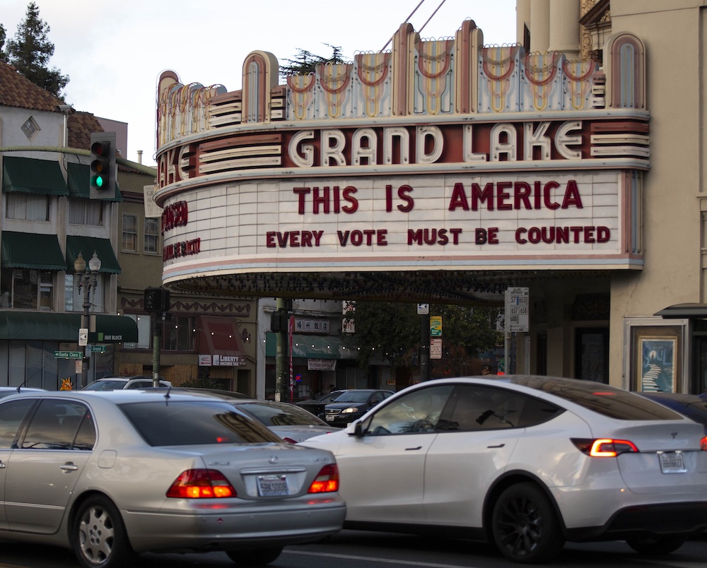 Around Town Iconic Grand Lake Theatre’s marquee displays election week message By Keith Burbank | Bay City News | November 7, 2020 Forget movies -- this feature is all about politics: "This is America. Every vote must be counted."