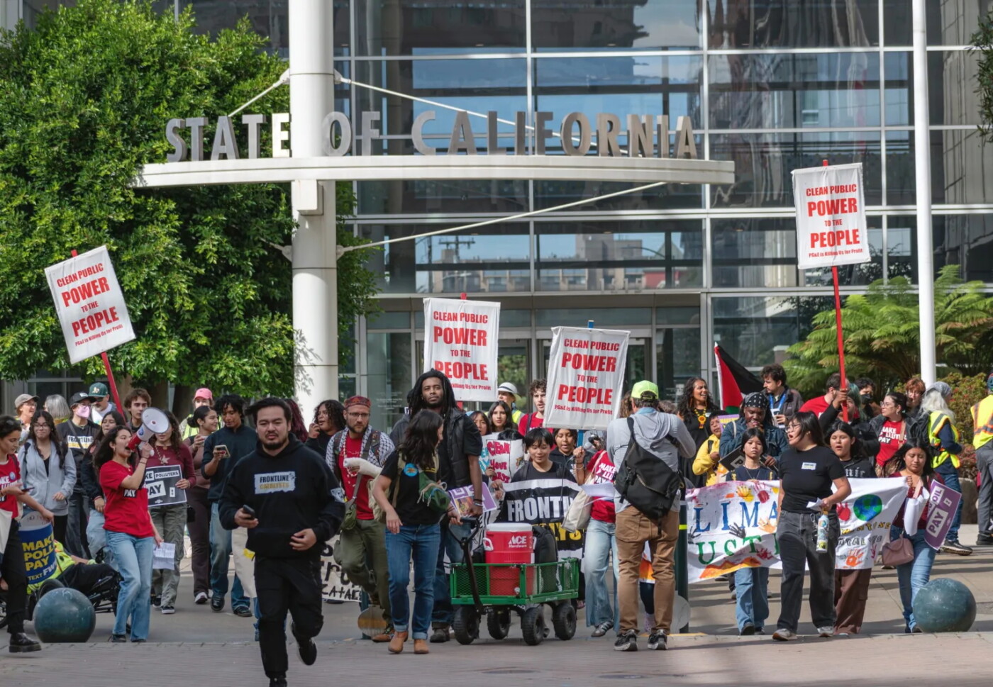 The march is part of an effort to pass state legislation requiring large corporations to offset their climate footprint by supporting environmental projects.