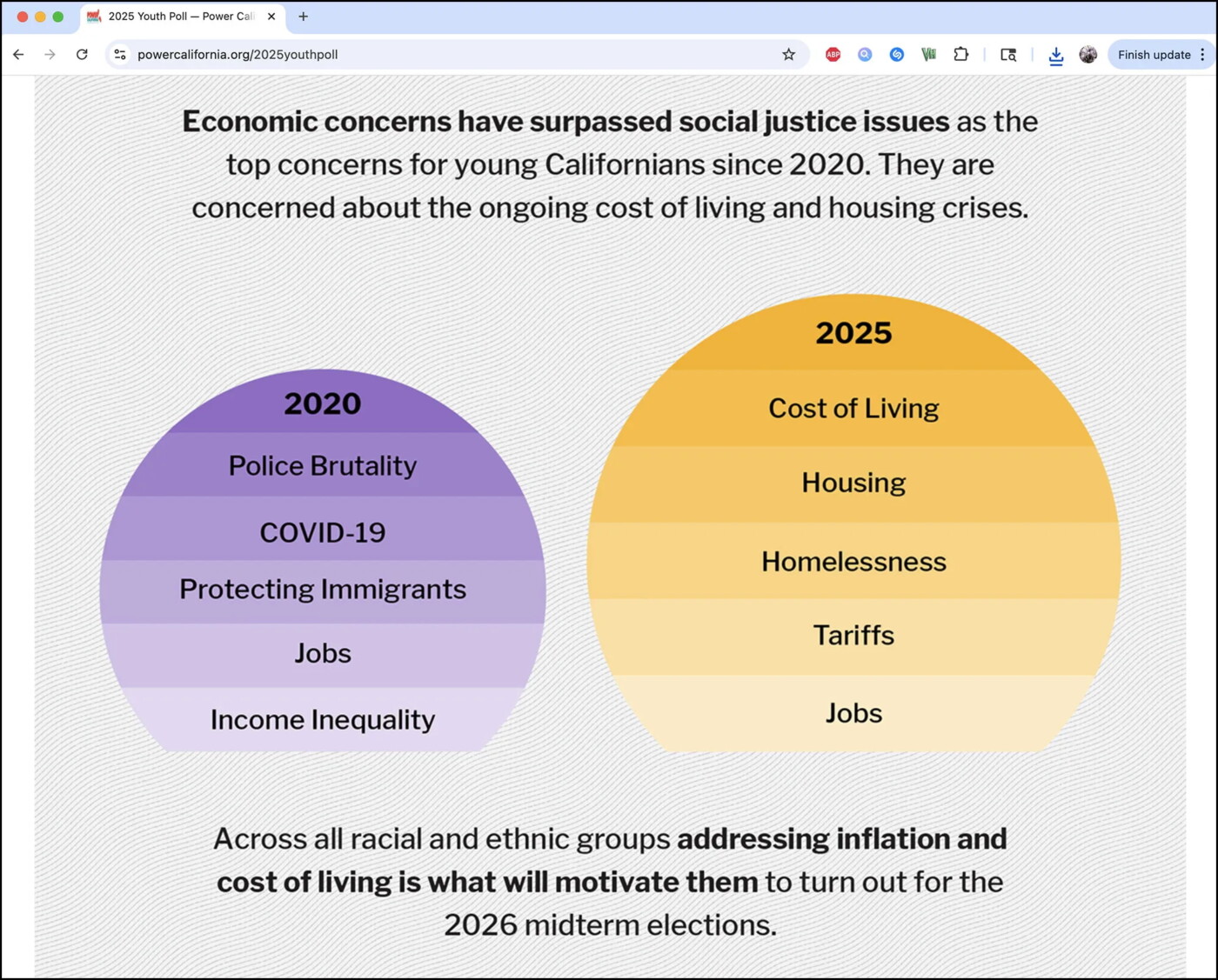 California Forget social justice: Cost of living, housing now top concerns for young California voters By Austin Zeglis | Bay City News | July 24, 2025 By 2028 Gen Zs and aging millennials will be the largest political voting bloc in the state.