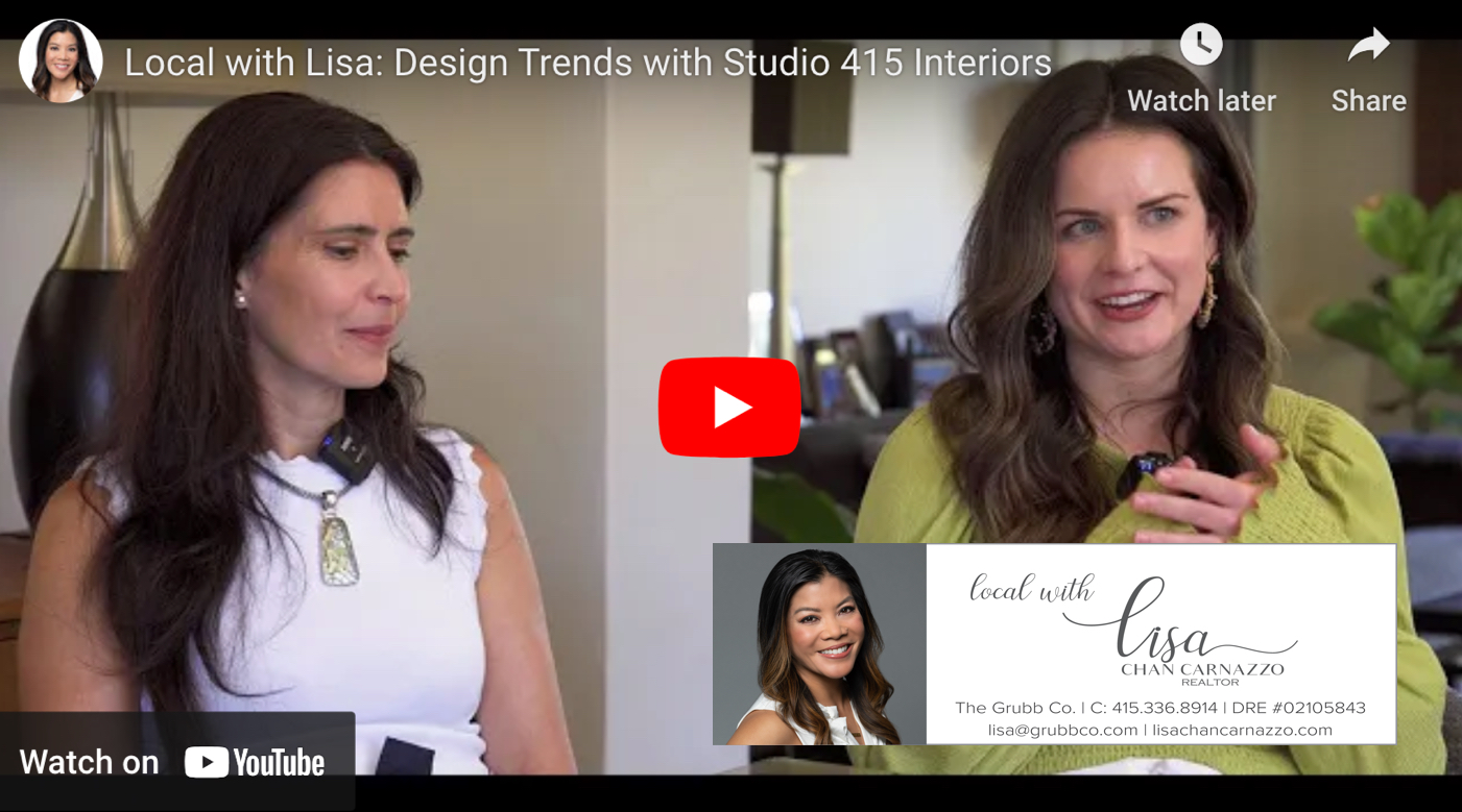 Around Town Local with Lisa | Design Trends with Studio 415 Interiors By Lisa Chan Carnazzo | GrubbCo | June 30, 2023 [SPONSORED VIDEO] GrubbCo realtor and journalist interviews interior design company founders, including Piedmont mom Bea Martinez.