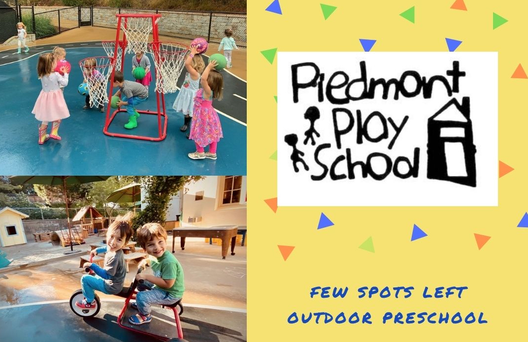 Around Town Openings for outdoor preschool program at Piedmont Play School By Piedmont Play School | August 10, 2020 There are still some openings at this centrally located, small cooperative preschool.
