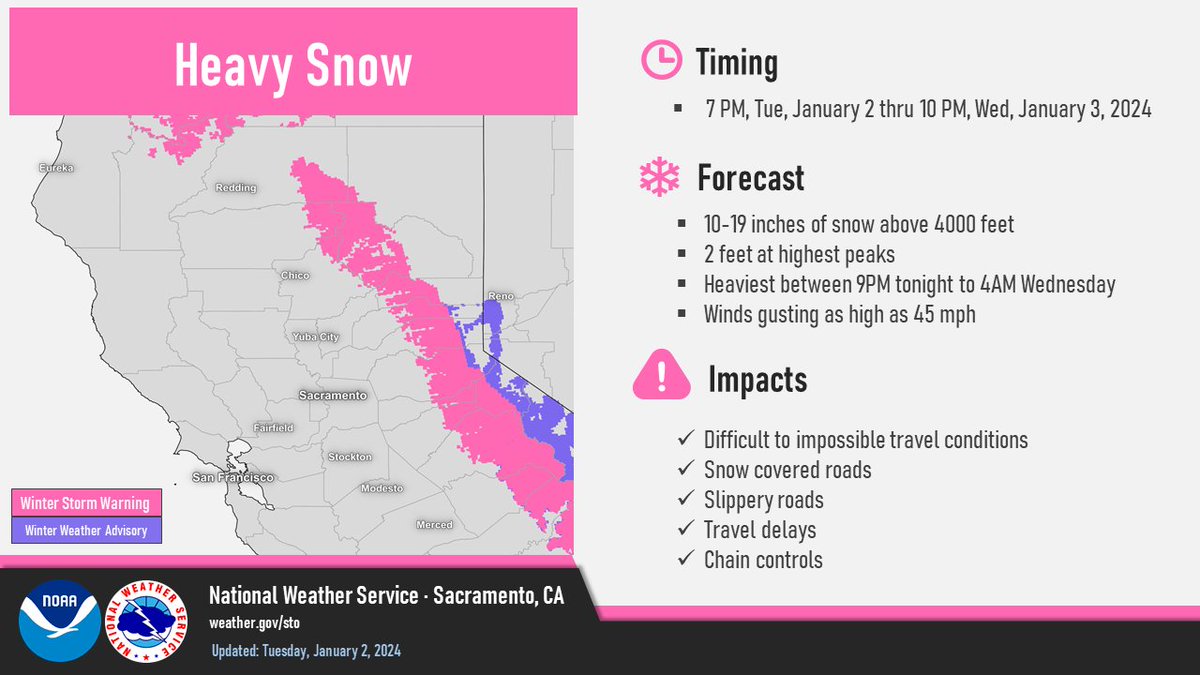 Featured in Category Headed to Tahoe? Winter storm warning in effect through Wed. night By Exedra Staff | January 2, 2024 Plus: Another High Surf Advisory for the coast.