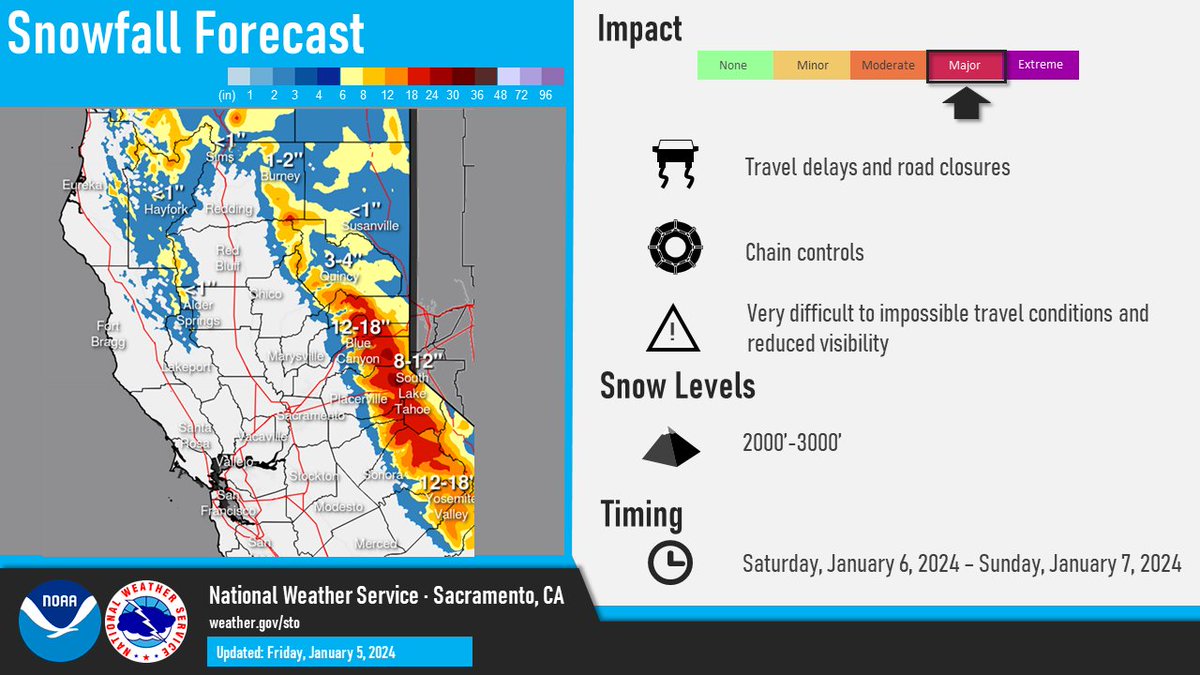 City Heavy snow expected in the Sierra Saturday – Sunday By Exedra Staff | January 5, 2024 Avoid travel to Tahoe on Saturday if possible.
