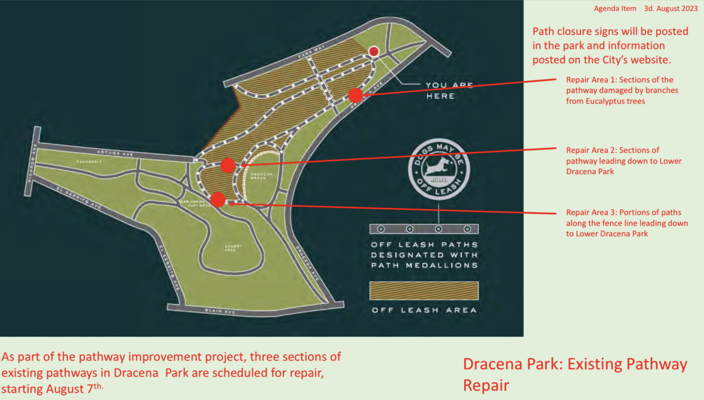 City City tackles pathway repairs in Dracena Park By Exedra Staff | August 25, 2023 This work is not related to ADA improvements coming to the upper part of the off-leash dog area.